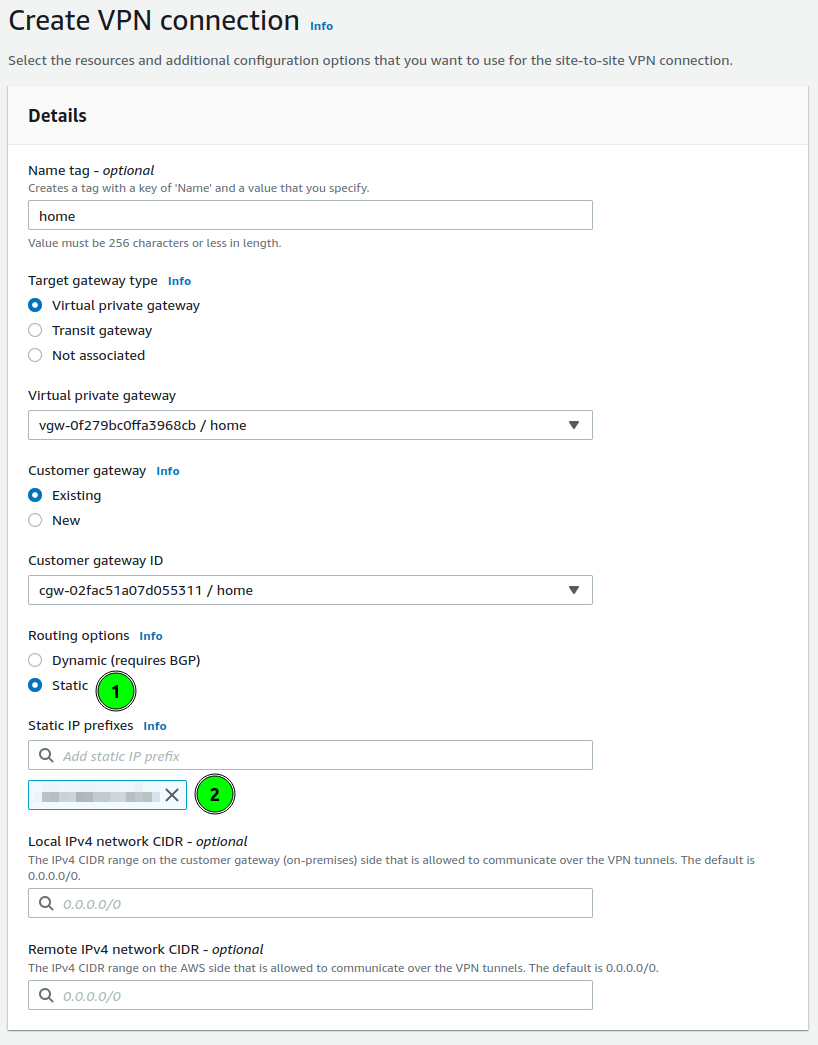 AWS allows for two options. to configure routing dynamic, based on BGP. And statically defined. In my case, I am using static.