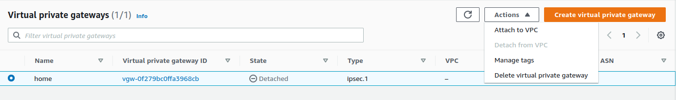 Previously I mentioned that the Virtual Private Gateway state is not attached to any VPC. We can reassign the VPN connection between VPCs by changing attachments.