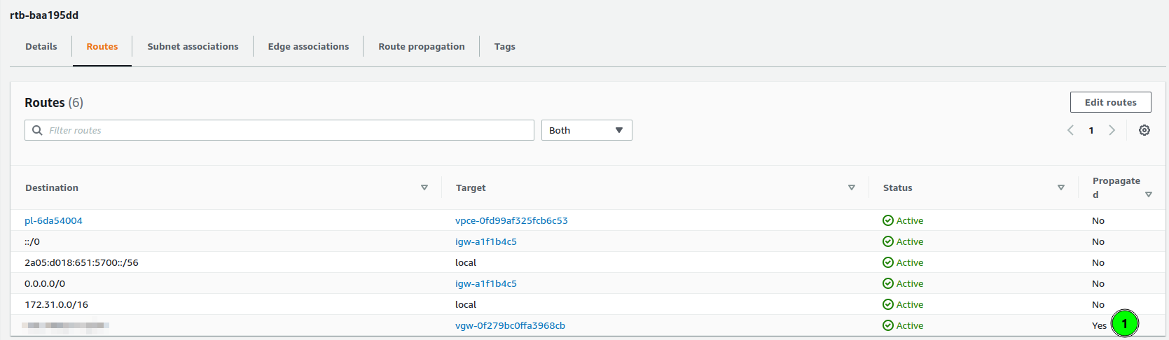 As you can see, the last route is “Propagated”, and it’s target is my virtual private gateway.