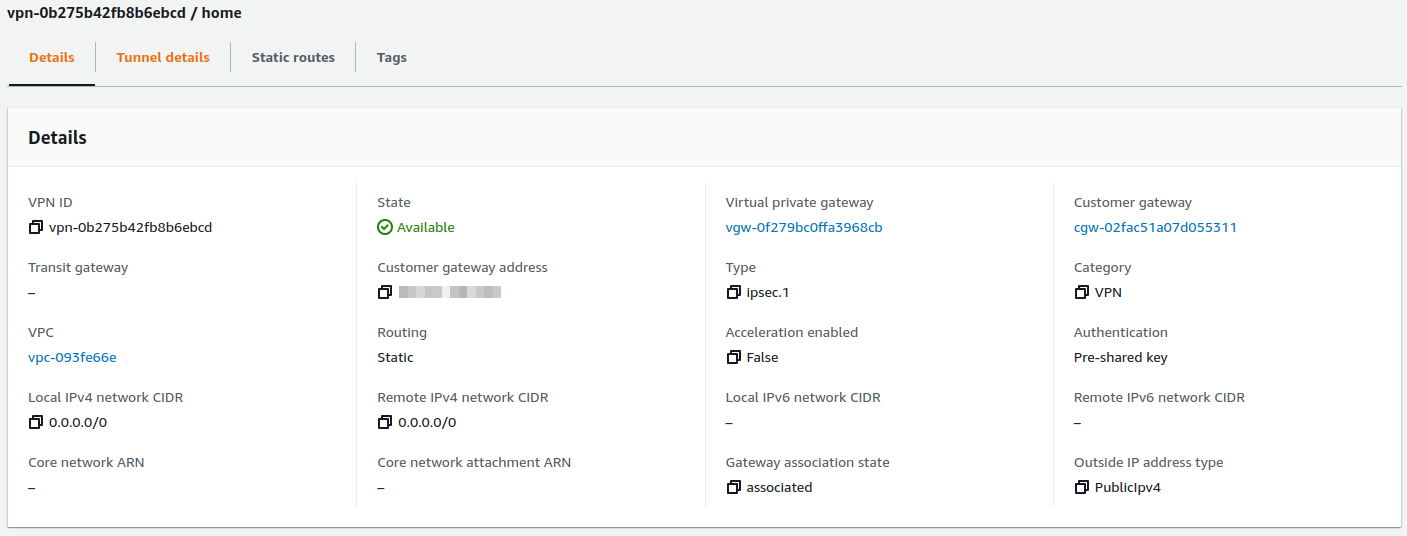 The first step is to create a VPN connection on AWS. For this blog I will use… the default VPC 🙂. To configure it AWS requires to define 3 components: Customer Gateway, Virtual Private Gateway and VPN connection.